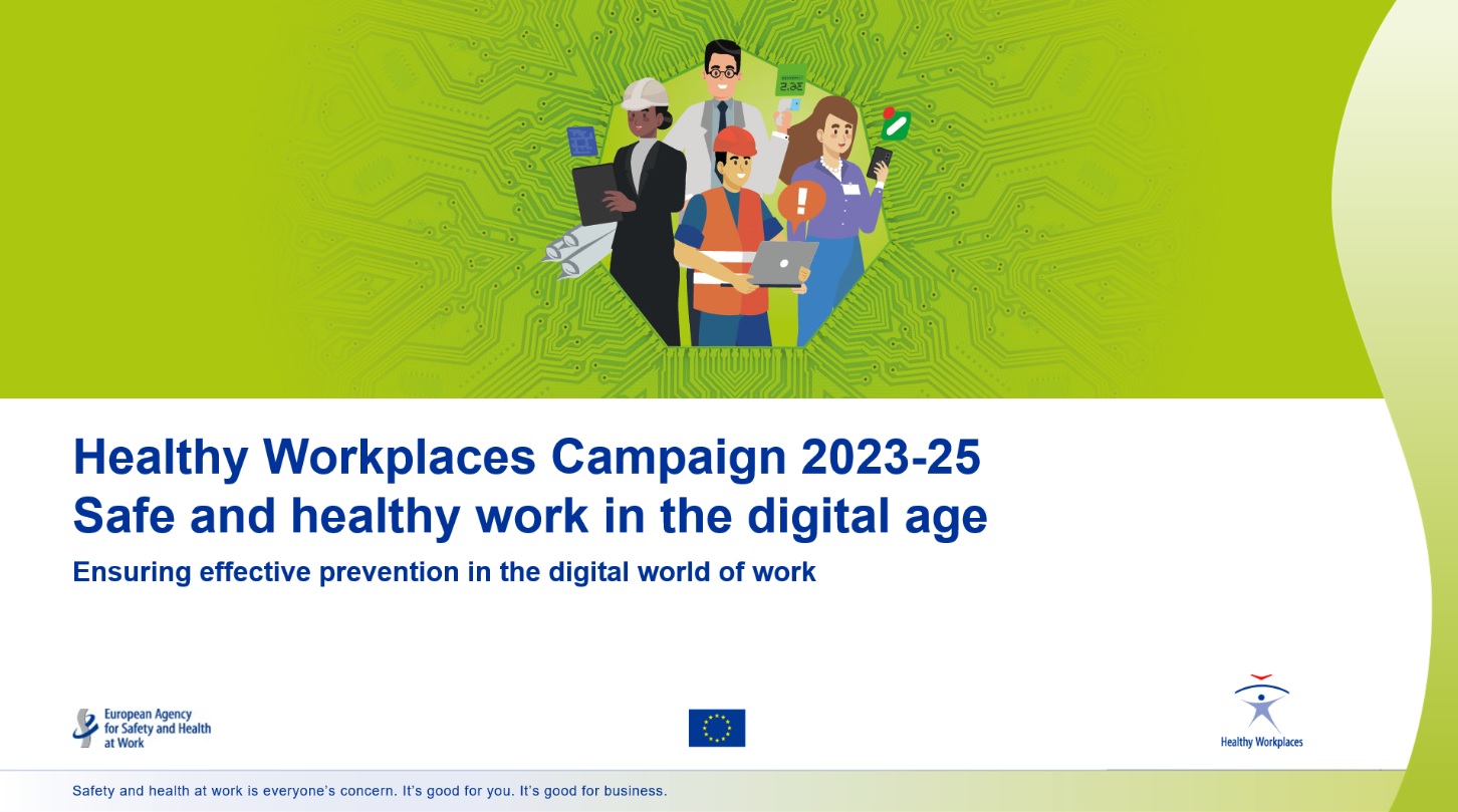 A campanha “Locais de trabalho seguros e saudáveis 2023-25 ” sensibiliza para o impacto das novas tecnologias digitais no trabalho e nos locais de trabalho e para os desafios e oportunidades associados em matéria de segurança e saúde no trabalho (SST). Proporciona igualmente uma plataforma para o intercâmbio de soluções em matéria de boas práticas.